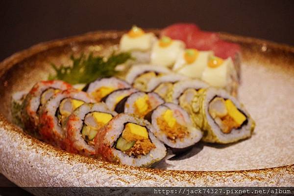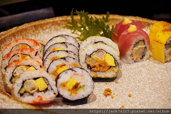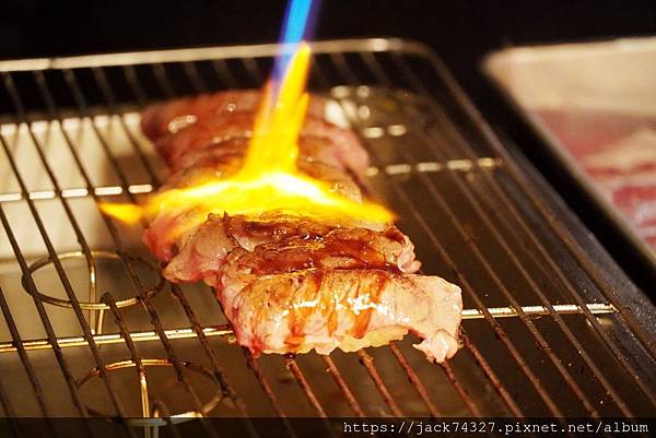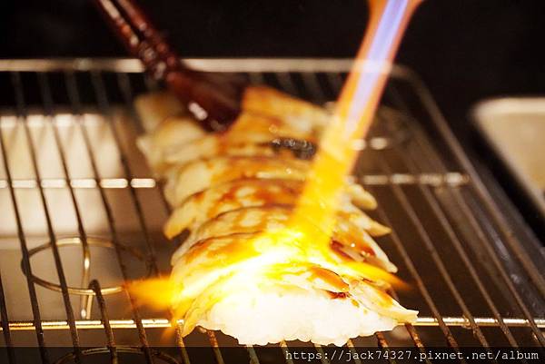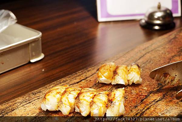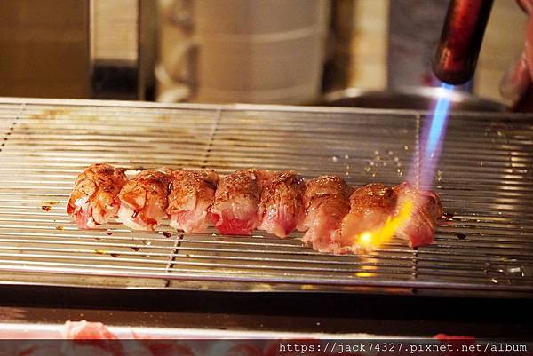 從生魚片、生牛肉握壽司用噴槍燒烤,適時的塗上醬汁,在用噴槍高溫燒烤,醬汁瞬間鎖在握壽司上,非常好吃