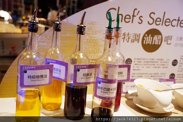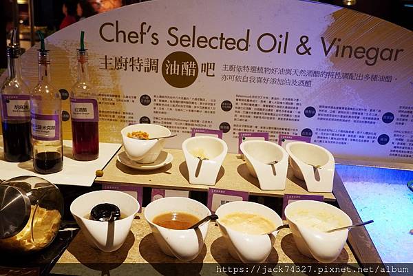 這裡的生菜沙拉的醬料很特別,主打「主廚特條油醋吧」,大家可以依照自己的喜好添加各式各樣的油醋醬,非常特別。