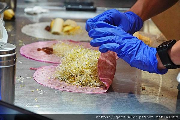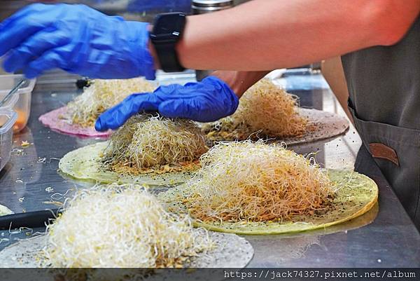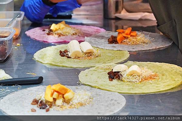 他們家的餅皮都是手工製作,有基本的白皮原味外,還加入各種食材原汁像是火龍果、菠菜、紅蘿蔔、芝麻等口味做成的餅皮可以選擇,